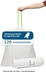 De afvalzakken met kleurcode groen worden geleverd per rol van 20 stuks. Deze verpakking bevat 6 rollen, wat neerkomt op een totaal van 120 afvalzakken.